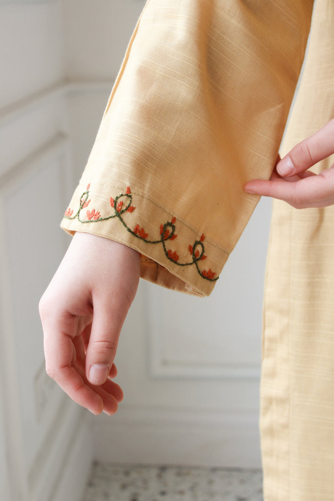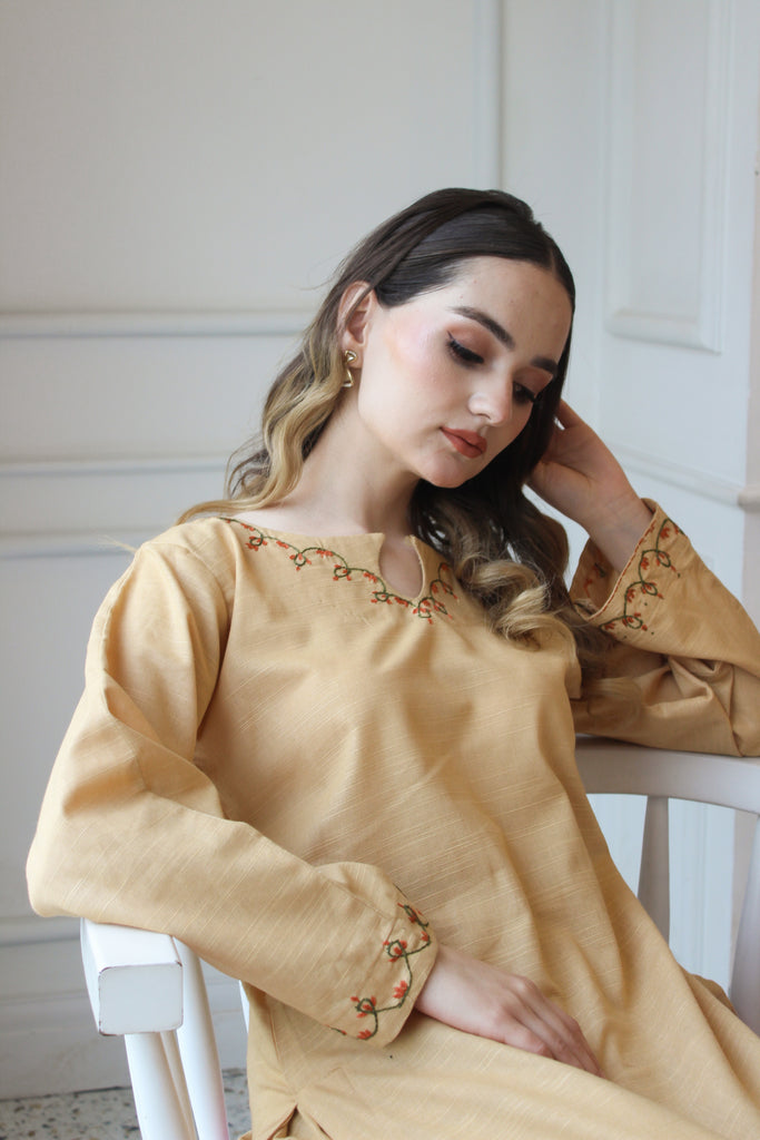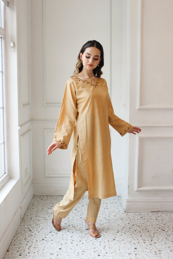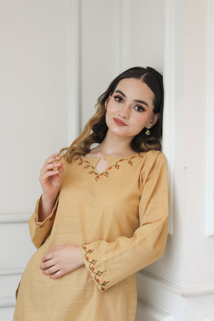 Julia embodies the warmth of sardiyon ki dhoop, designed as a reliable staple for clear winter days. Rendered in a sun-kissed tan khaddar, it features a classic round neckline with a subtle keyhole, framed by rhythmic embroidery in terracotta and vine-green tones. These traditional motifs trail along the cuffs, lending a heritage feel to the overall silhouette. Paired with matching straight-fit trousers, it is a look perfected for your everyday.