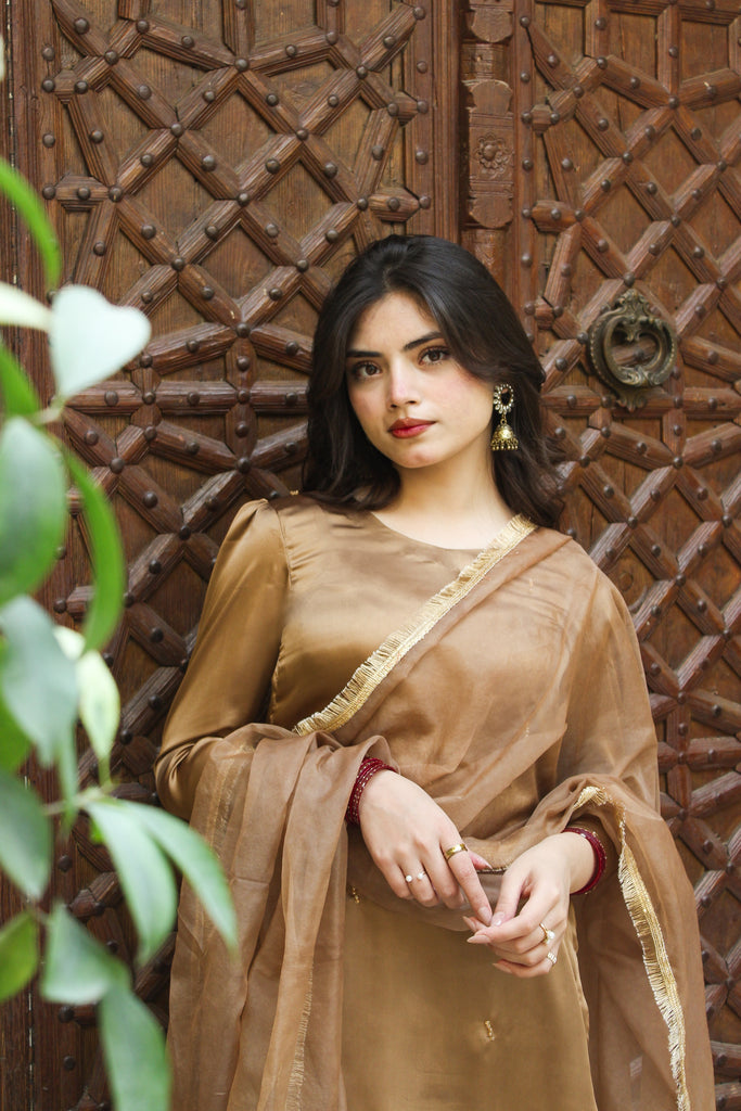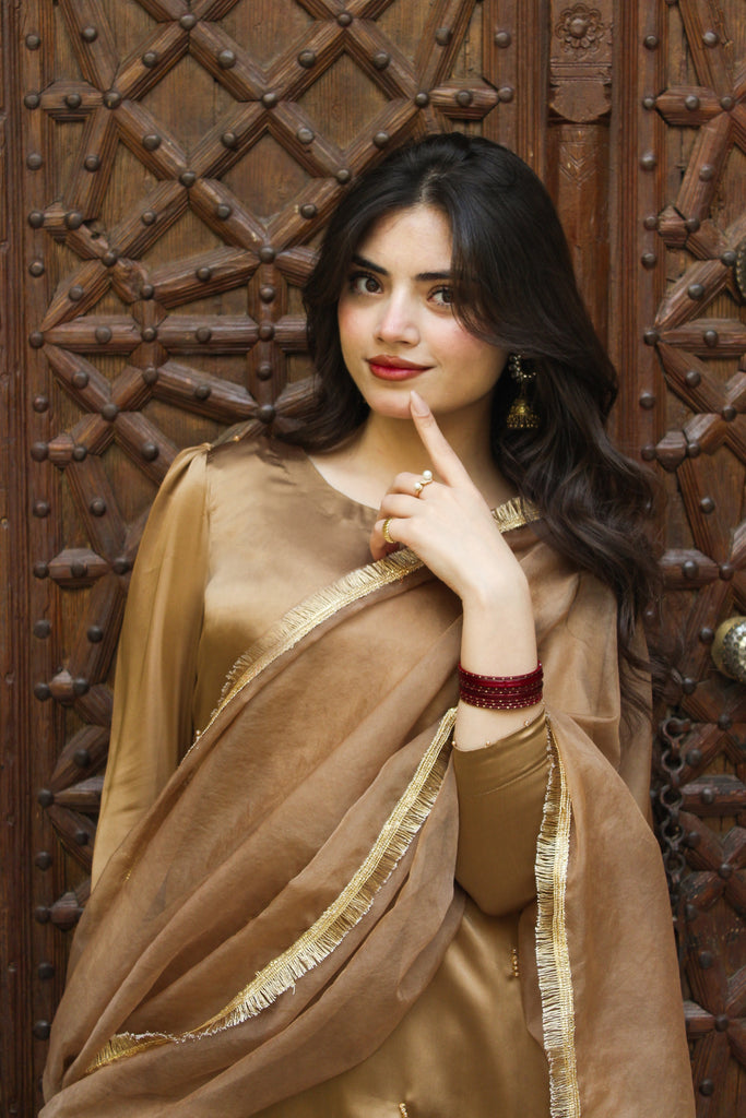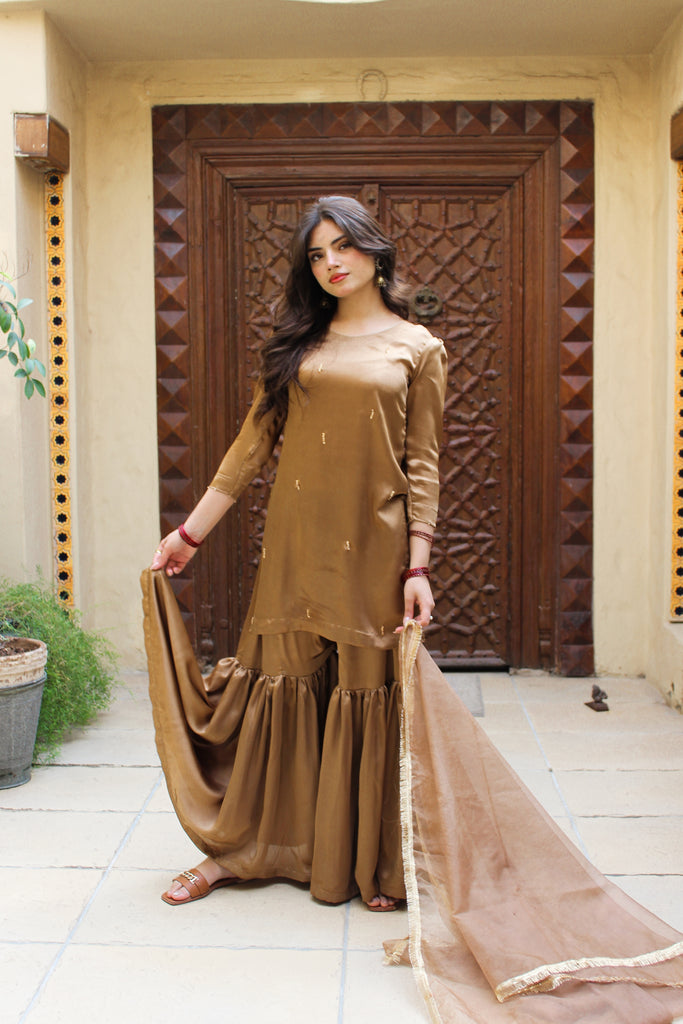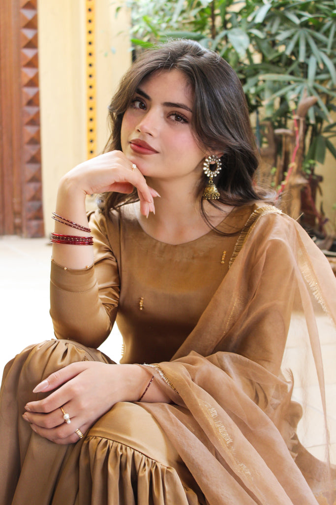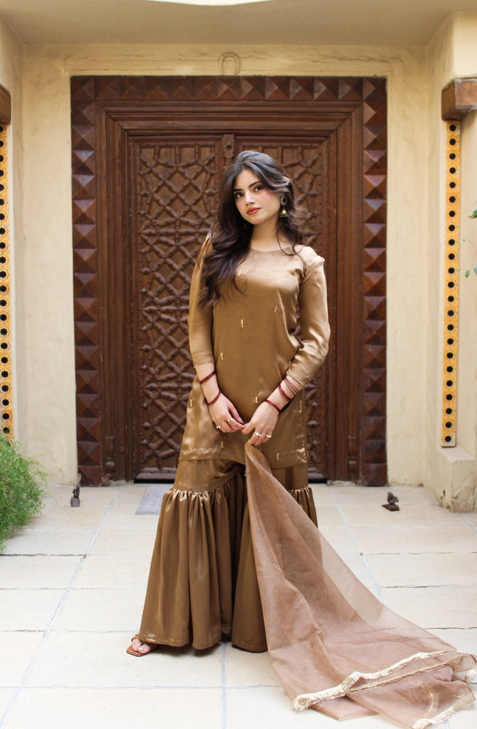 Introducing Sitara, a copper gold silk gharara set made for Eid. The shirt features delicate sitara and moti handwork, with subtle moti detailing on the sleeves for an added touch of elegance.